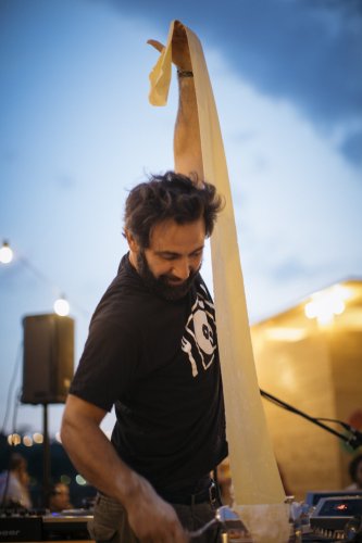 On stage, he uses music and pots and pans at the same time, mixers and mini blenders to blend music and veloutés. A console, a kitchen counter, stoves and coffee, with good vibes and flour, tender and durum wheat for the irreplaceable hand-cranked “Imperia” that makes tagliatelle. All the senses are called into play: